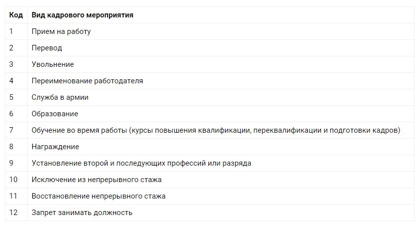Предусмотрена следующая кодировка по видам кадровых мероприятий: