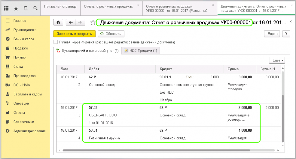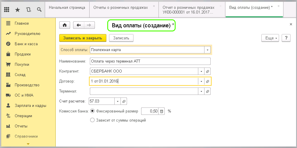 Когда вид оплаты будет создан, нужно указать оплаченную картами сумму и сделать проводку. Созданные проводки должны быть такими: