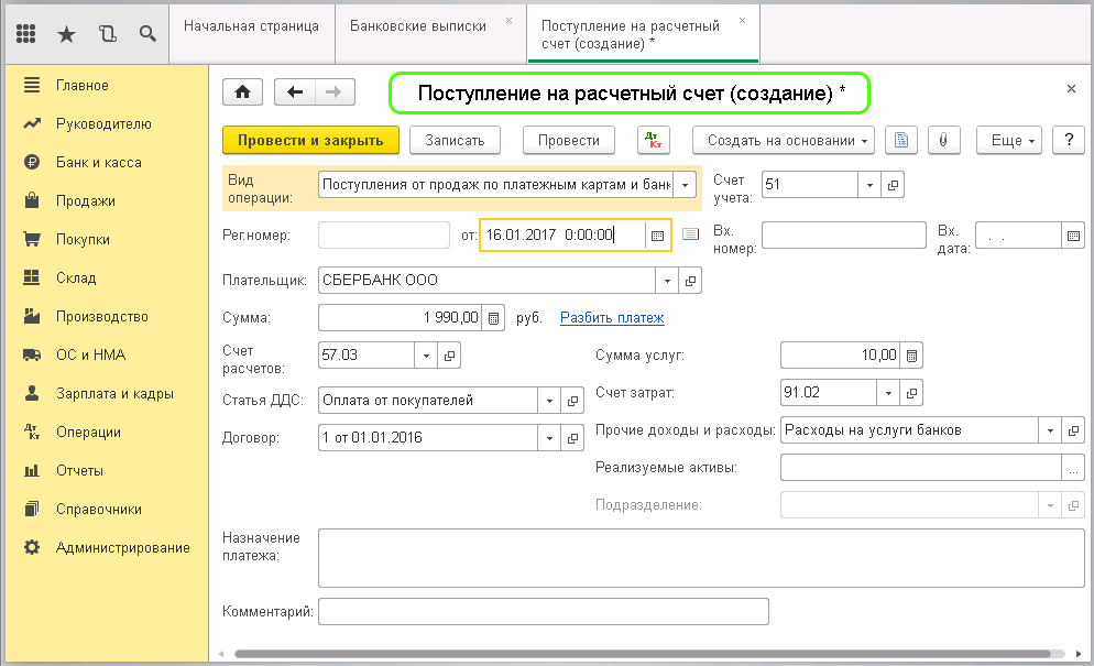 Когда документ будет проведён, нужно загрузить банковскую выписку, показывающую, что средства на расчётный счёт поступили. Введён документ может быть и на основании оплаты картой: