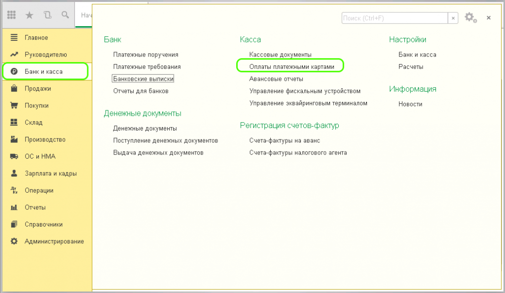 Для неавтоматизированных торговых точек эквайринг проводится иначе, так что его стоит разобрать отдельно. Перейдите в раздел «Банк и касса», а оттуда в «Оплату платёжными картами».