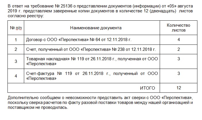 В письме обязательно указывается перечень документов, отправленных для проверки. В случае если в требовании контролеров были прописаны дополнительные вопросы, налогоплательщик включает пояснения к каждому из них.