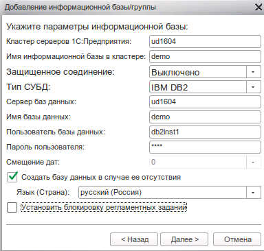 Для подключения к ново созданной базе данных 1С потребуется ввести имя сервиса и базы.