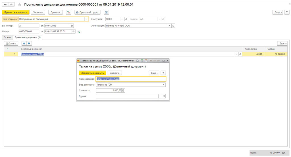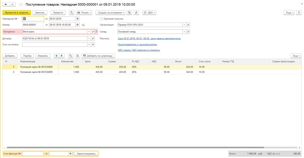 Когда компания подписала договор с АЗС на покупку карт топливных и распределение ГСМ работникам по выставленным организацией лимитам, используем третий вариант документооборота в 1С.