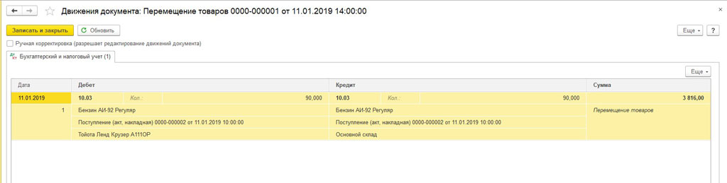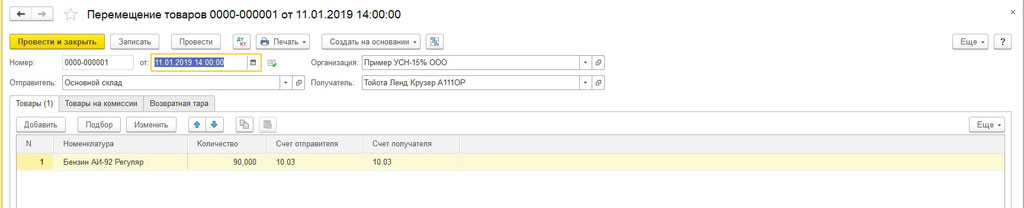 Сформированы перемещения ГСМ с общего склада на авто (склад) на основании путевых бланков работников.