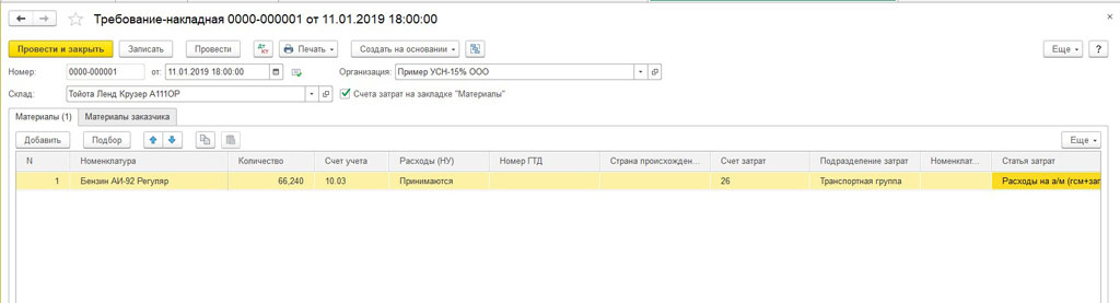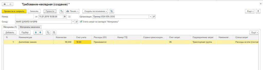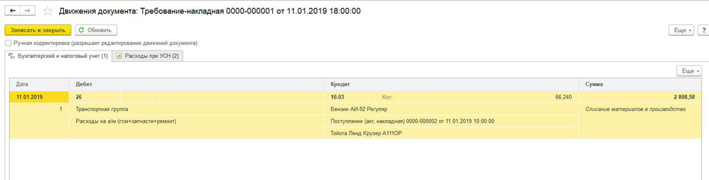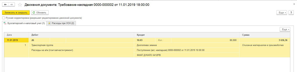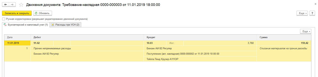 Для отражения списания ГСМ применяется документ «Требование-накладная»