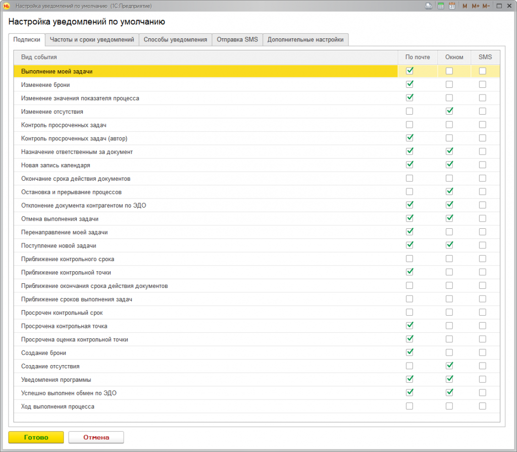 Система 1С:Документооборот содержит в себе настройку уведомлений, для того чтобы каждый пользователь знал о предстоящих мероприятиях. Такая информация может поступать человеку по СМС, по электронной почте или в виде всплывающего окна.