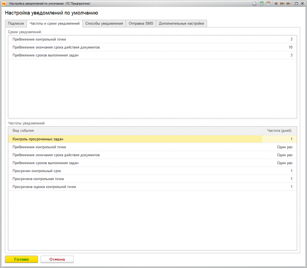 Нужно помнить, что всегда можно создать свои собственные виды уведомлений, которые изначально отсутствуют в системе. Но об этом нужно говорить отдельно. Далее, в следующей вкладке устанавливаются сроки и частота отправки уведомлений. Верхнее окно - события, нижнее - частоты.