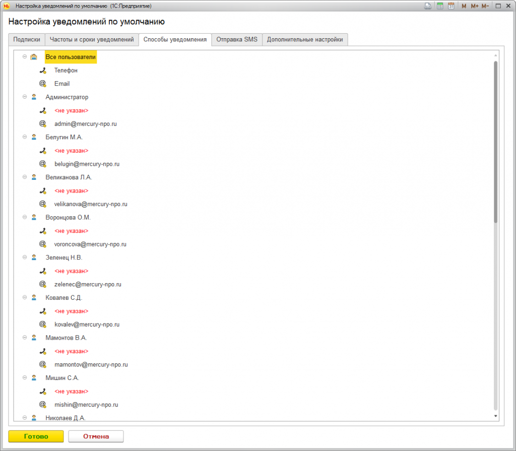 На вкладке "Способы уведомлений" указаны способы доставки сообщений пользователям системы - от электронной почты до СМС. Здесь же можно перейти к индивидуальной настройке для каждого сотрудника.