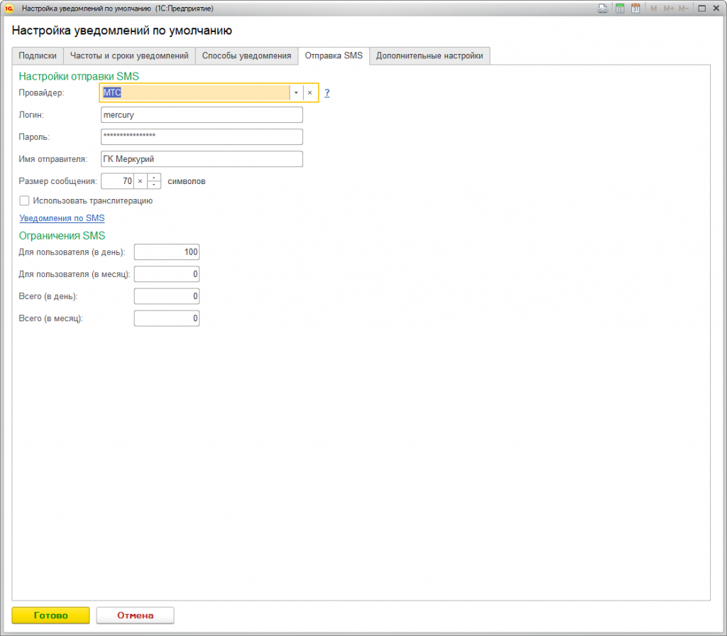На вкладке "Отправка SMS" указаны все параметры и ограничения по рассылке.