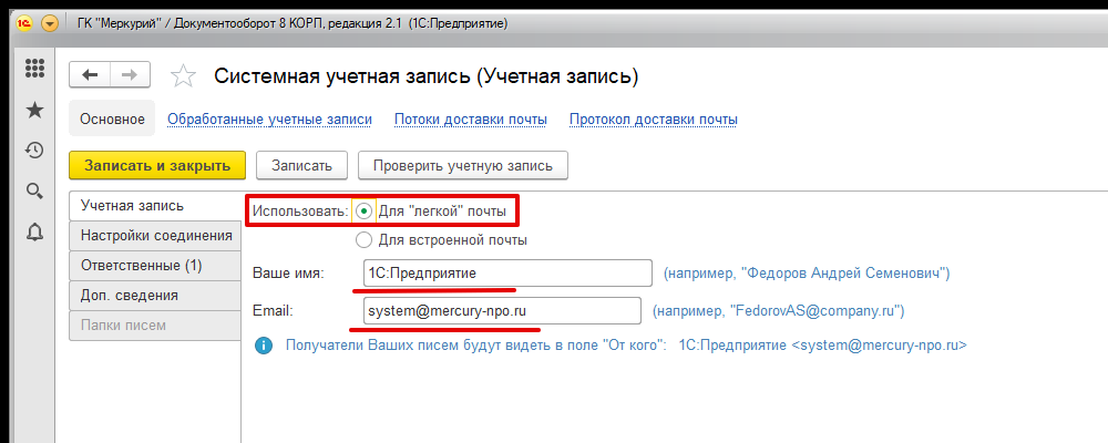 Здесь же устанавливаем параметр "Для легкой почты". Указываем наименование и адрес e-mail, откуда пользователям будут приходить письма. Данное наименование будет видно в поле "От кого".