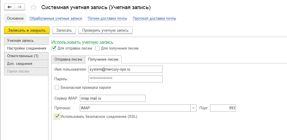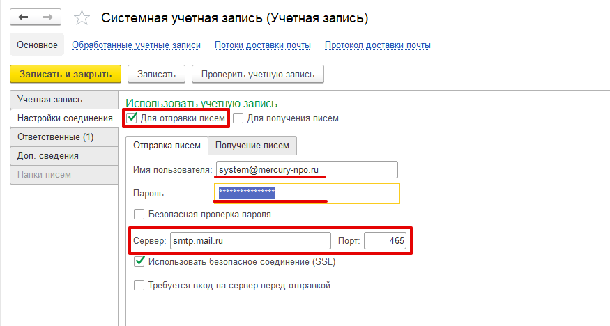 В настройках соединения указываются все параметры учетной записи пользователя для успешного соединения с почтовым сервисом.