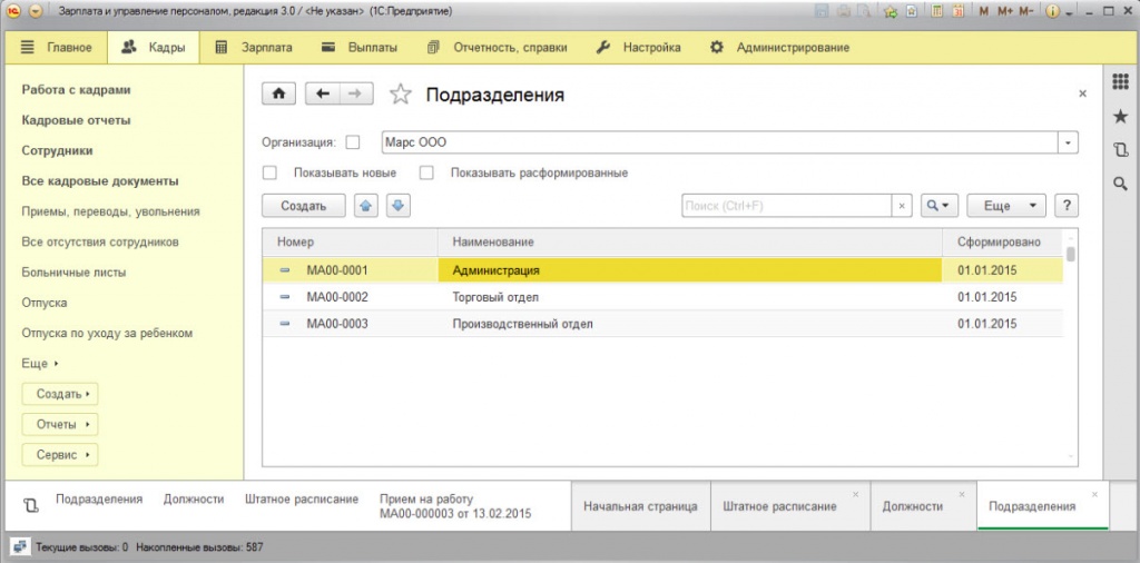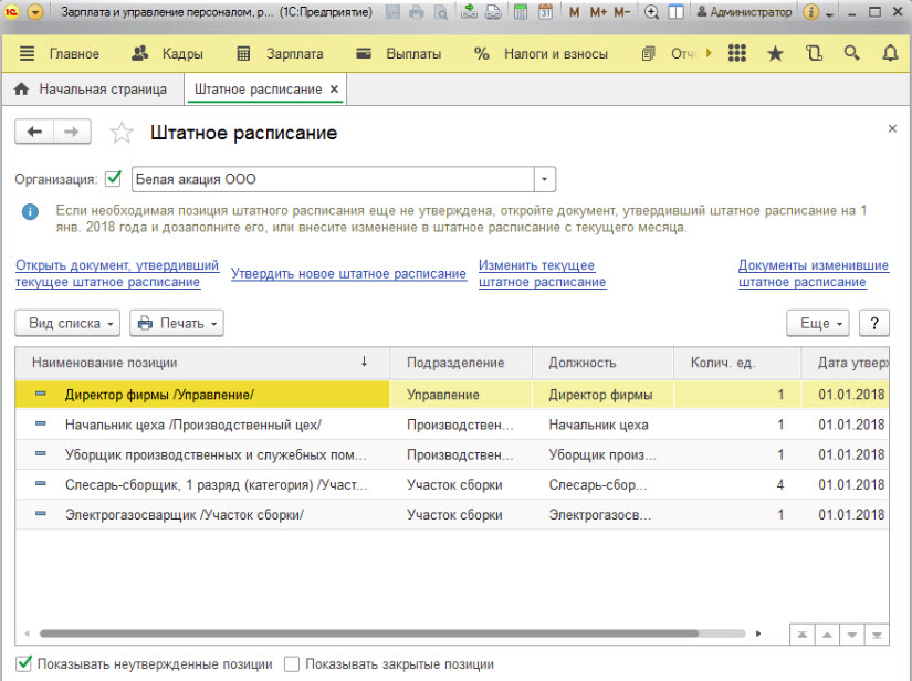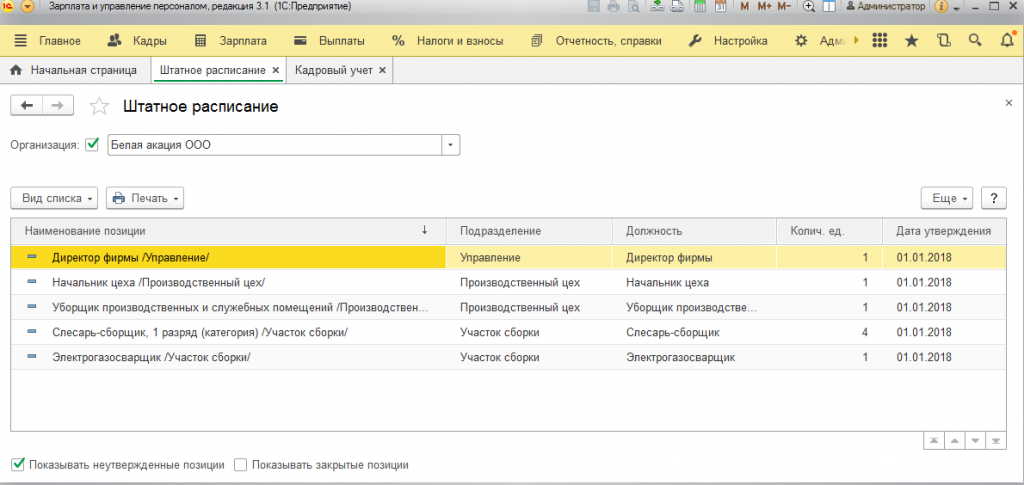 Штатное расписание в 1С