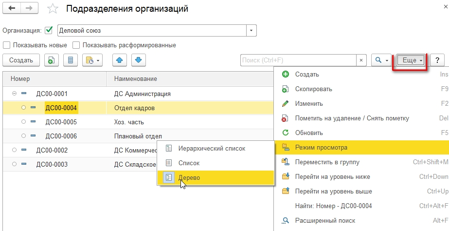В случае установки флажка и последующего выбора интересующей организации, в список будут включены одни лишь ее отделы. Что бы было максимально удобно, для списка подразделений возможно задание трех режимов просмотра, и это достигается посредством нажатия вкладки «Еще»: