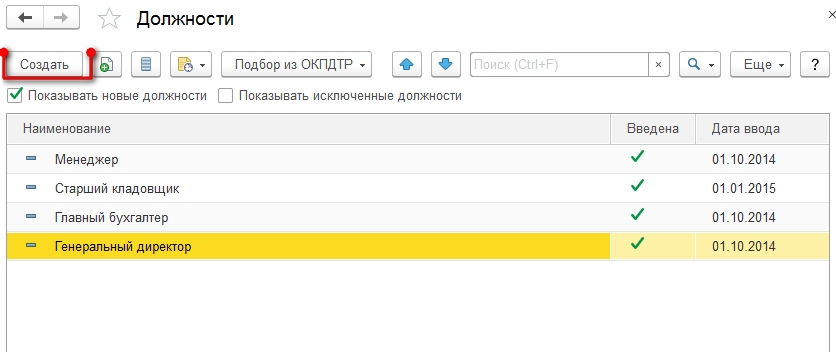 Что бы создать новую должность, необходимо нажать на вкладку «Создать», после чего они туда вносятся. Если данная процедура производится вручную, это самый простой способ, однако, он вовсе не является наиболее оптимальным.