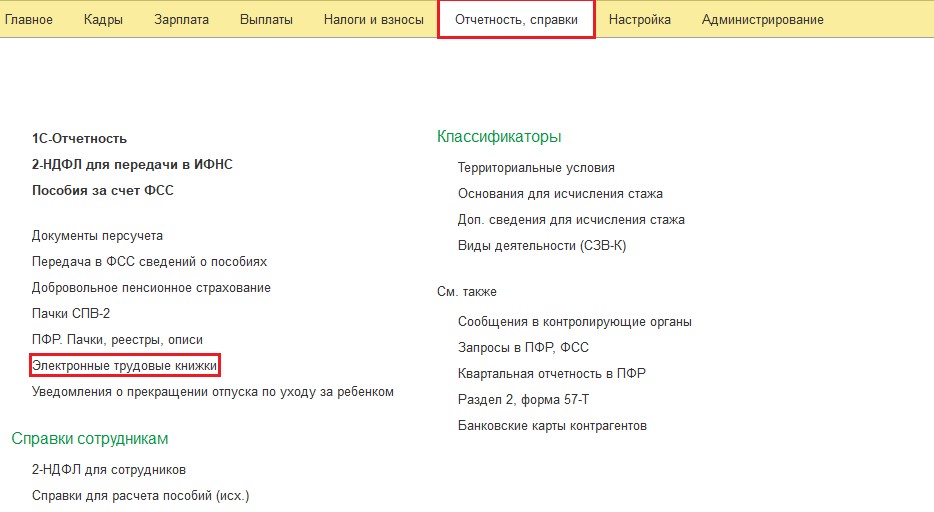 После того, как вы проверите актуальность ПО, перейдите в отдел «Отчётность, справки» и нажмите на «Электронные трудовые книжки».