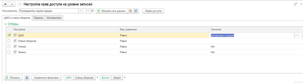 Разделение прав доступа на уровне записей по ЦФО в БИТ.ФИНАНС