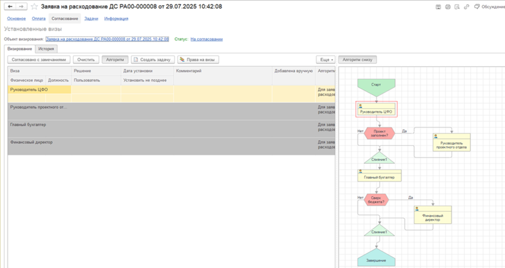 Формирование и согласование платежей также осуществляется в разрезе ЦФО. Подразделения-инициаторы создают заявки на расходование денежных средств, которые проходят согласование ответственными лицами, включая руководителей ЦФО. После утверждения заявок в системе автоматически формируются платежные документы. Статусы заявок — «В работе», «Утверждена», «Оплачена» — доступны пользователям в режиме онлайн.