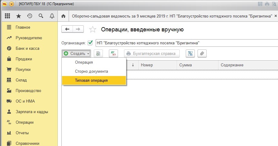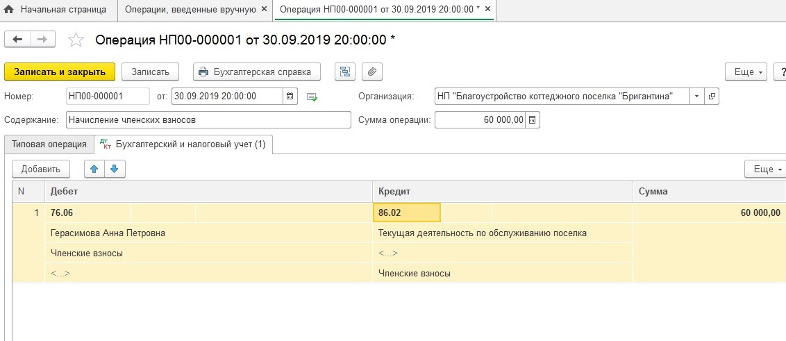Как было сказано ранее, не предусмотрен программой документ для отображения начисления взносов. При необходимости можно это обозначить ручным способом. Создав в НКО типовую операцию, с помощью которой каждый месяц начислять членские взносы: