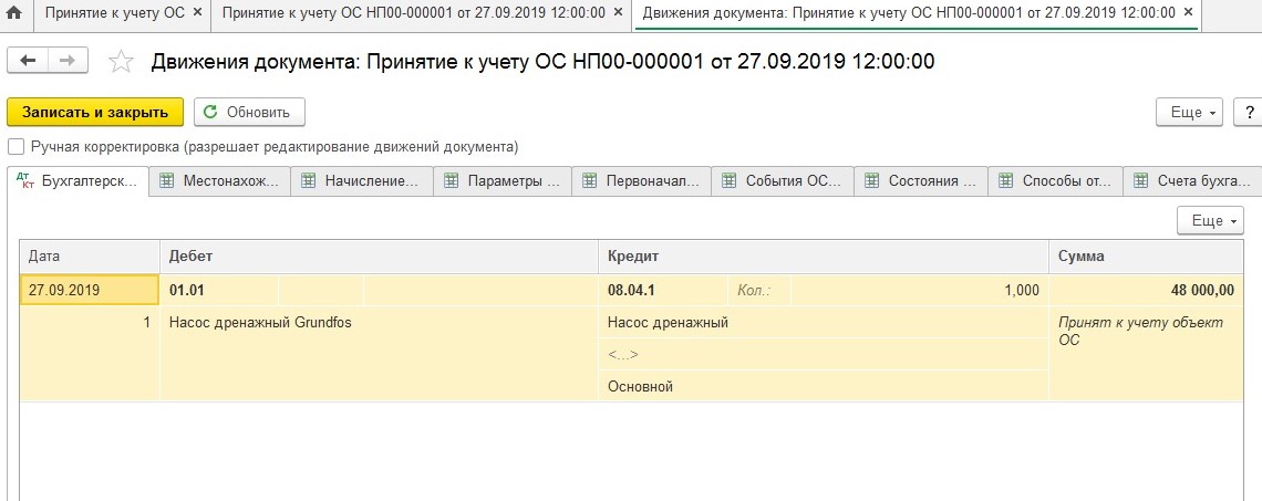 Этот документ для НКО не формирует проводку по приобретенному объекту основных средств. Поэтому требуется произвести проводку в ручном режиме, отредактировав движение документации установив соответствующие галочки "Ручная корректировка", также добавления к существующей проводке