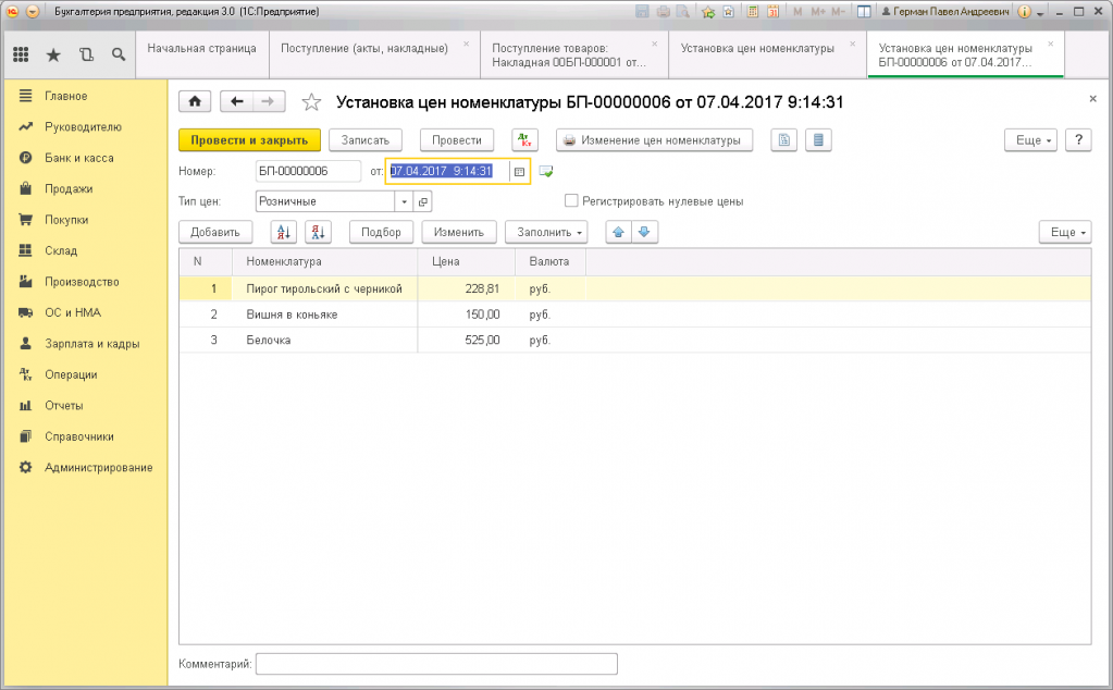 Следующим этапом регистрации товара и подготовки его к продаже является установление цены. Это делается с помощью документа «Установка цен номенклатуры». Его можно найти в меню «Склад». Данные вносятся специалистом вручную, при этом можно на все товары устанавливать цены автоматически в предыдущем документе. Такой вариант подходит предприятиям, использующим фиксированную торговую наценку.