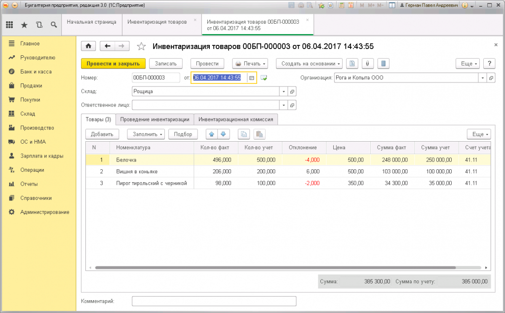 Перед продажами принято делать инвентаризацию в соответствующей вкладке в меню «Склад» – «Инвентаризация товаров». Данная возможность позволяет отразить остатки по складу и заполнить «Торговый зал» автоматически. В этом случае на экран выводится вся доступная номенклатура на складе с фактическим количеством. Остается только проверить физическое соответствие товара и подготовить его продажу в учете. Если товар продан, он должен появиться в колонке «Отклонение».