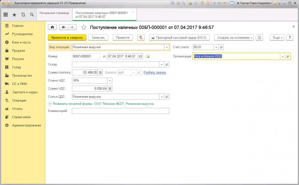 Этот документ можно найти в меню «Банк и касса», он называется «Поступление наличных».