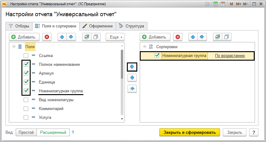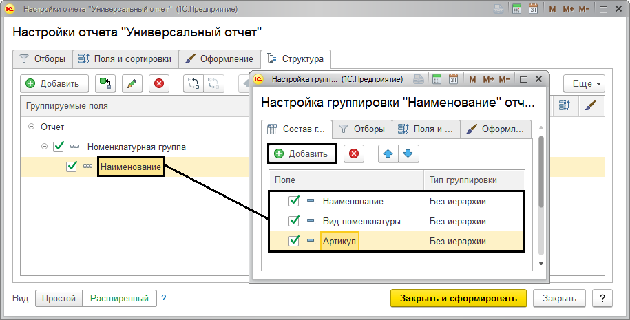 Чтобы наш отчет принял более компактный вид для удобного просмотра, снова перейдем в настройки на вкладке «Структура» и добавим поля для группировки в разрезе номенклатурной группы. Таким образом первым полем у нас будет номенклатурная группа, а все данные будут разворачиваться по каждой группе.