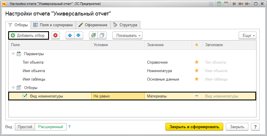 Данный отчет может напомнить один из стандартных отчетов «Оборотно-сальдовая ведомость по счету», который может отображает такую информацию. Но ключевая особенность «Универсального отчета» в его способности показывать данные, которые не найти и не сформировать в стандартных отчетах 1С:Предприятие. Например, если необходимо отобрать лишь данные по конкретной номенклатурной группе «Металлические изделия собственного производства», из всего объёма реализованной продукции. Чтобы это реализовать, необходимо нажать на кнопку «Настройки...» и на закладке «Отборы», воспользовавшись кнопкой «Добавить отбор», сделаем «Товары.Номенклатура.Номенклатурная группа» по условию равным «Металлические изделия собственного производства». Чтобы применить настройки нажимаем «Закрыть и сформировать».