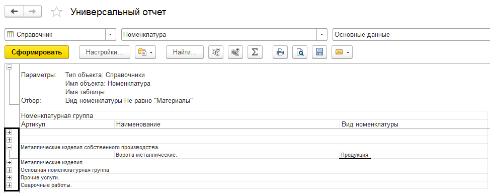 В результате отчет будет содержать данные со всеми видами номенклатуры, кроме материалов.