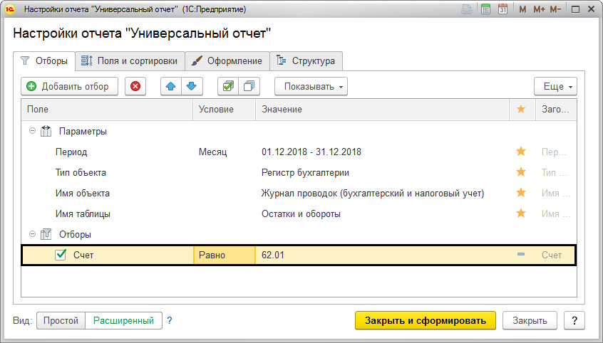 Отчеты по регистрам, которые выбрали, сформируются по умолчанию и не требуют настройки. Для регистра бухгалтерии настройка выглядит следующим образом:
