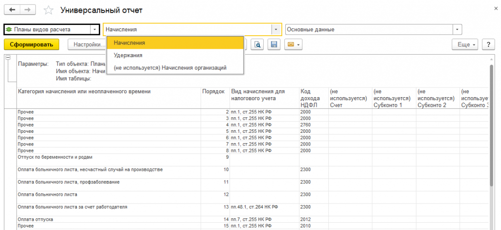 Пользователь системы таким же образом может настроить отчет по «Планам видов расчетов» – начислениям и удержаниям.