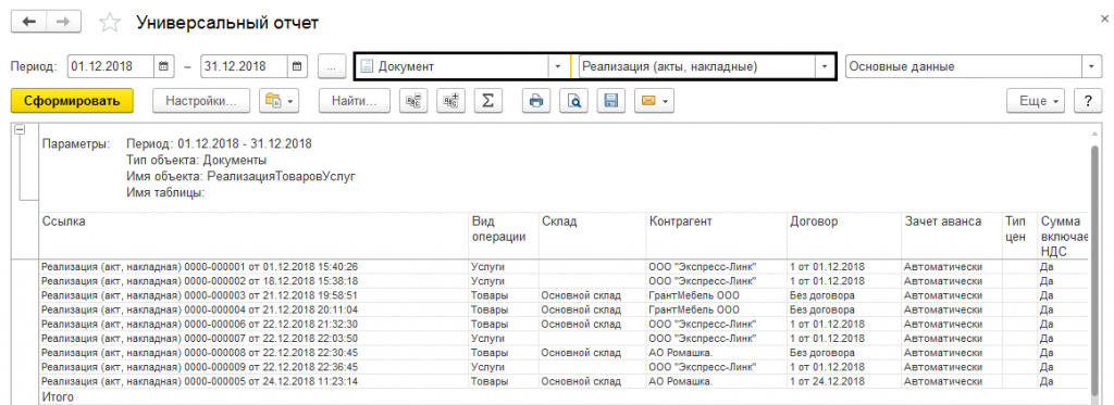 Универсальный отчет приходит на помощь, когда стандартных отчетов не хватает или требуется выбрать специфическую информацию, а готового варианта отчета подходящего для этого просто нет.