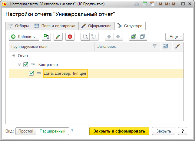 Таким образом, мы используем различные отборы для формирования нужных данных с помощью «Универсального отчета». В нашем отчете не так много информации, но при больших объёмах информации «Универсальный отчет» ещё позволяет задавать структуру отчета, для группировки данных по какому-либо признаку. Например, в отчете требуется сгруппировать данные по всем контрагентам, по месяцам. Заходим снова в настройки отчета и переходим на вкладку «Структура». На неё задаем группировку по полю «Контрагент» и дополнительную структуру данных под ней, например: Дата, Договор и Тип цен. Снова формируем отчет кнопкой нажатием на «Закрыть и сформировать».