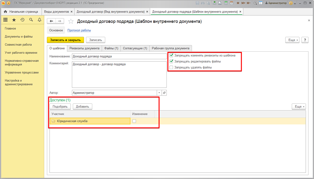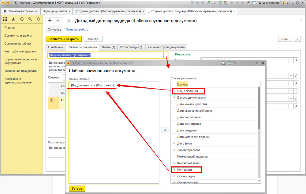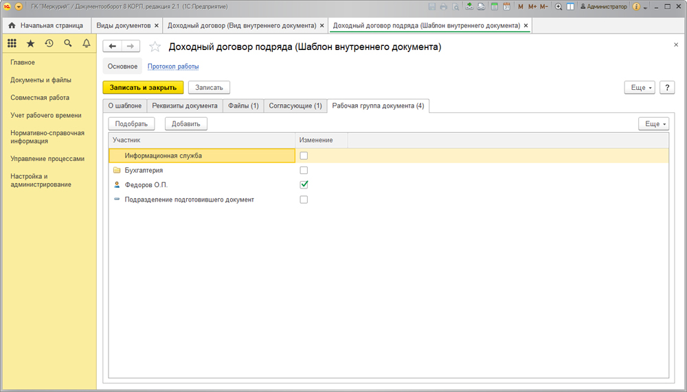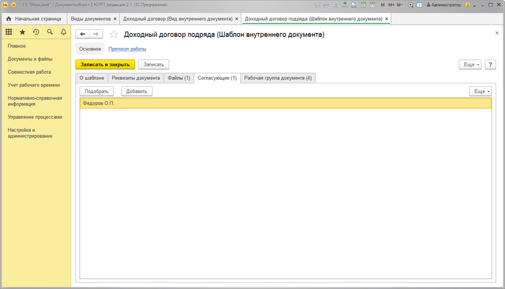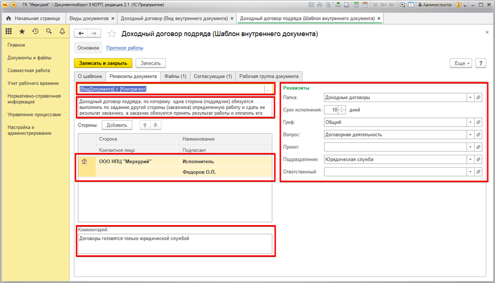 • если указать в шаблоне список лиц, согласующих данный документ, а также перечень лиц, входящих в рабочую группу по данному договору, то это исключит ошибки компетенции (когда договор попадает на подписание непрофильному ответственному специалисту).