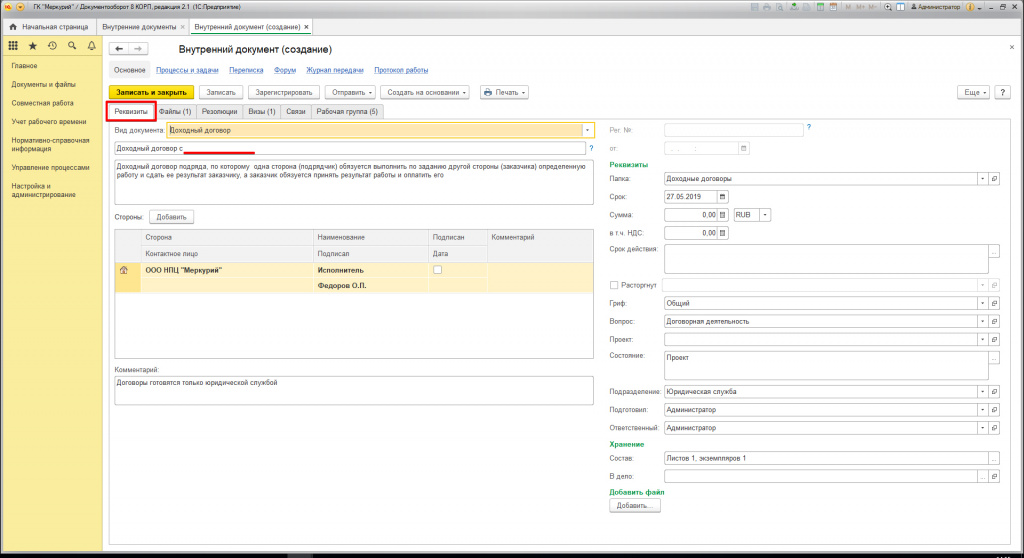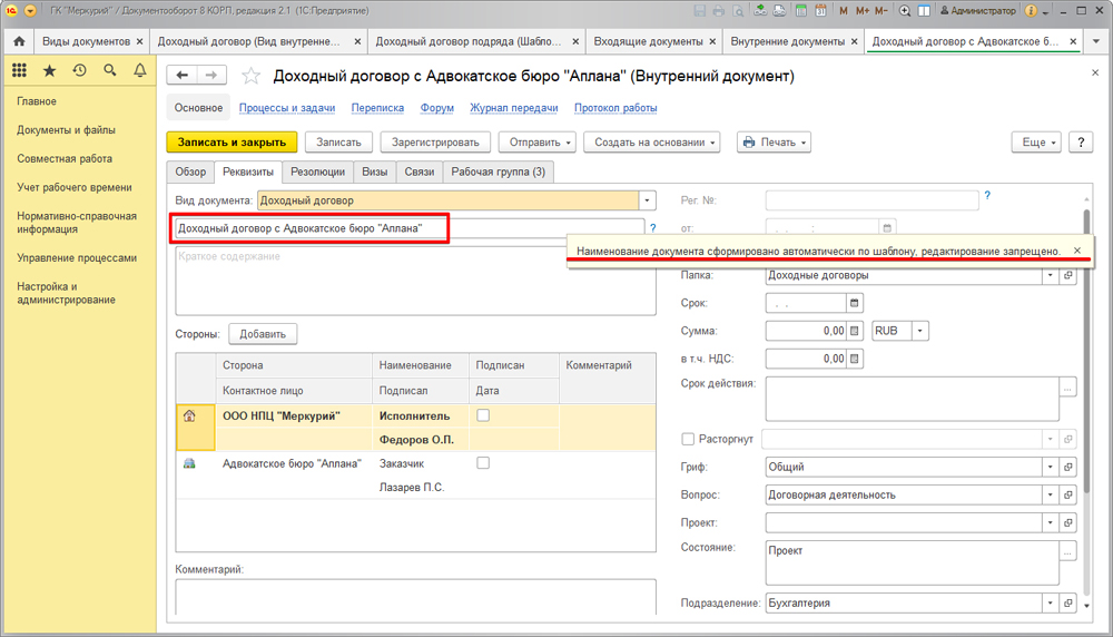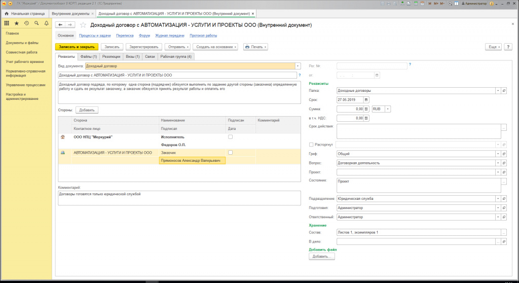 • заполнены все данные о рабочей группе по договору, а также автоматически сформирован перечень лиц, согласующих данный документ.