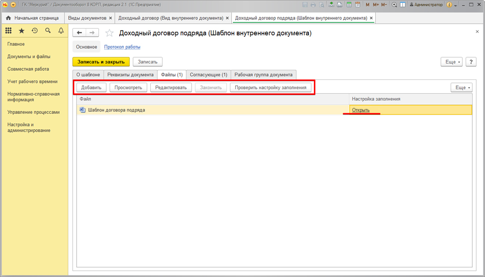 Теперь обратимся ко вкладке «Файл»: сюда можно приложить сразу несколько шаблонов электронной формы договора.