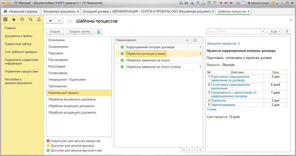 В последнем случае необходимо сформировать шаблон комплексного бизнес-процесса (раздел «Управление бизнес-процессами», п. «Шаблоны процессов»).