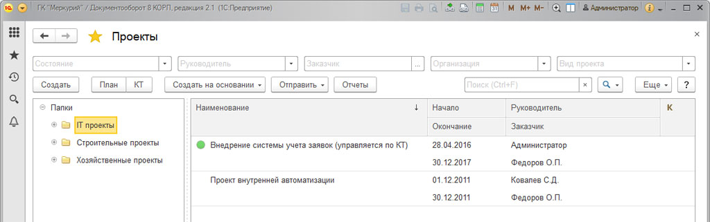 Наличие подсистемы управления проектами – вот одно из отличий версии КОРП в программе «1С:Документоооборот» от версии ПРОФ.
