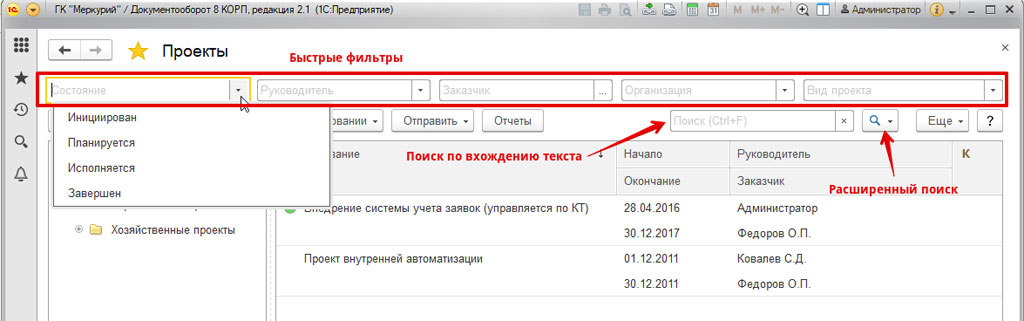 Список проектов снабжен функциями быстрого отбора, расширенным поиском и поиском по вхождению текста.