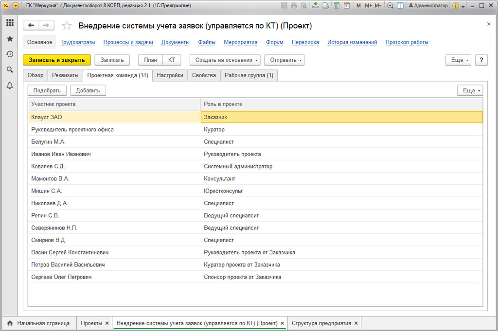 Обратите особое внимание: «Проектная команда» и «Рабочая группа» - это совершенно разные списки! Не все участники проектной команды могут иметь доступ к проекту, также, как и не все пользователи системы, имеющие доступ к проекту, относятся к проектной команде. Служба качества компании проверяет корректное соблюдение всех проектных методик и корпоративных технологий, при этом ее сотрудник участником проектной команды не является.