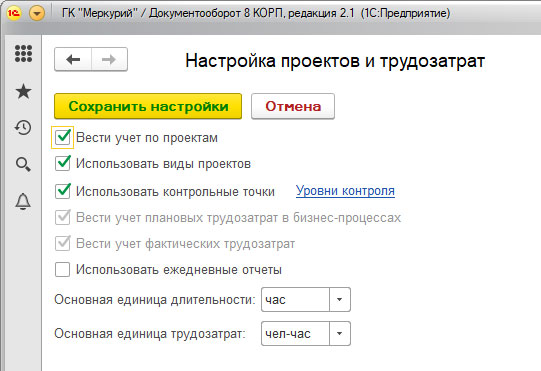 Чтобы начать проект в программе необходимо, для начала, активировать подсистему в меню программы «Настройка», выбрать раздел «Настройка и администрирование», затем выбрать параметр «Вести учет по проектам» в закладке «Проекты и трудозатраты».