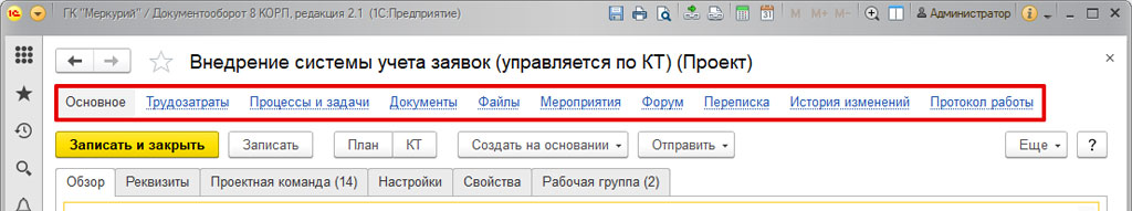 Следующая вкладка представляет собой информацию об основных реквизитах карточки проекта.