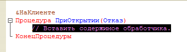 Для чистоты процедуры мы создадим обработчик события, который будет обнулять булевы реквизиты при открытии обработки. Создаем обработчик &НаКлиенте, который запускается ПриОткрытии через контекстное меню по щелчку на форме.