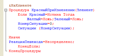 - Логическое выражение не может закончился без команды Иначе, поскольку процедура должна выполнить какое-либо действие и в том случае, когда условия не выполнены. Иначе РеакцияПешехода=Неопределено; КонецЕсли; КонецПроцедуры.