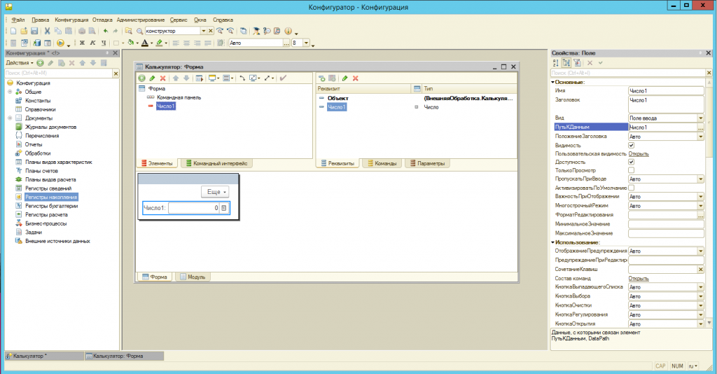 Далее необходимо добавить в форму элемент «Поле», через который будет задаваться реквизит «Число1». Для этого в свойствах поля необходимо указать в строке «ПутьКДанным» реквизит «Число1». Чтобы облегчить задачу, перетяните мышкой реквизит из правой части окна в левую. Соответствующее поле будет создано автоматически.