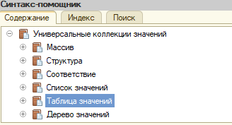 Найдем а Синтаксис-помощнике Универсальные коллекции значений. Помимо вышеназванных, существуют также хранилища Структура, Список значений, Таблица значений, Дерево значений.