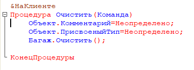 Для очистки табличной части реквизита «Багаж», реквизитов «Комментарий» и «ПрисвоенныйТип» создадим команду «Очистить», поместим ее на форму и напишем процедуру-обработчик этой команды.