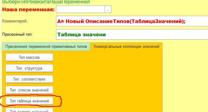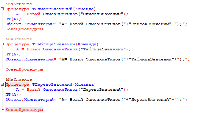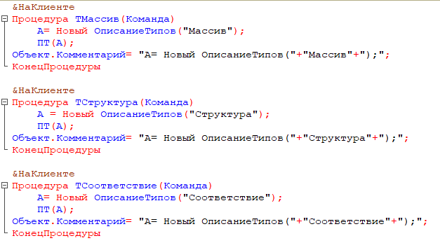 Теперь напишем процедуры–обработчики команд, которые назначат переменной А тип универсального хранилища значений. При этом в поле Комментарий отобразится используемый в обработке код.
