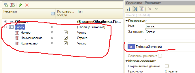Для знакомства с ТаблицейЗначений, во-первых, создадим на управляемой форме реквизит Багаж (тип ТаблицаЗначений) с колонками реквизита: Номер (тип Число), Наименование (тип Строка), Количество (тип Число).