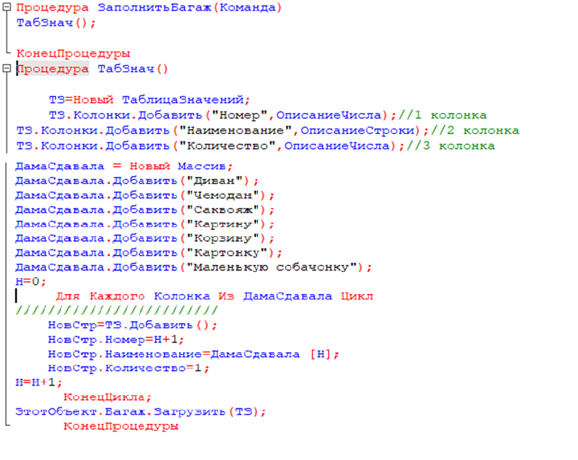 В составе процедур-обработчиков команды «Заполнить» созданы универсальные коллекции значений: Массив –«ДамаСдавала» и ТаблицаЗначений-«ТЗ». Перебирая в цикле элементы массива, заполняем построчно таблицу значений и затем загружаем табличную часть реквизита формы «Багаж» - типа ТаблицаЗначений из заполненной ТаблицыЗначений –ТЗ.